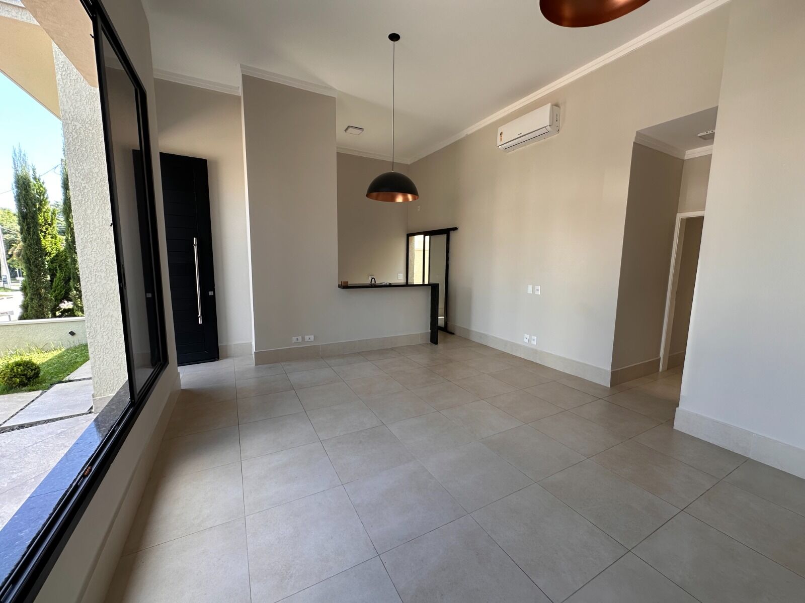 Tem uma sala grande com pé direito alto e uma ótima entrada de luz natural.